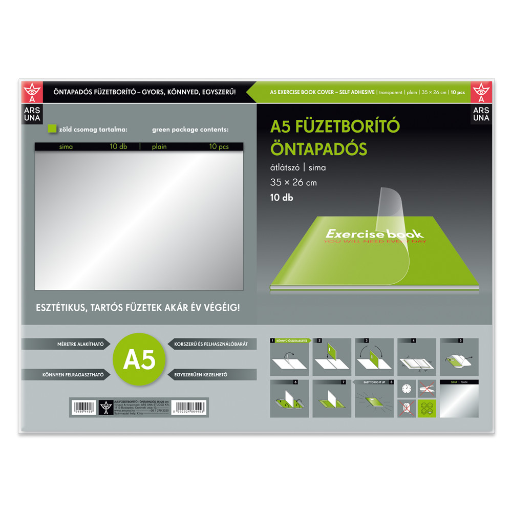 Ars Una A/5 öntapadós füzetborító - Egyszerűen használható, könnyen felragasztható, tartós védelem a füzeteknek. Alsósoknak-felsősöknek ajánljuk. Mérete: 350x260 mm